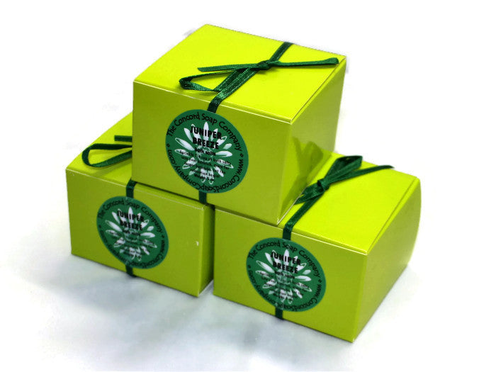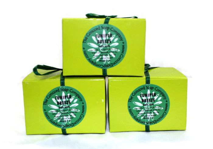 Our bath salts are handmade in small batches to focus on quality. This five ounce box of salts can be used for more than one bath. Our Juniper Breeze bath salts are packaged in a small zip top plastic bag, placed inside a lime green box and sealed with a green ribbon and label.