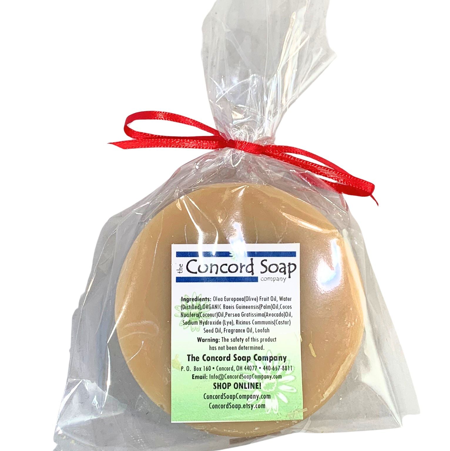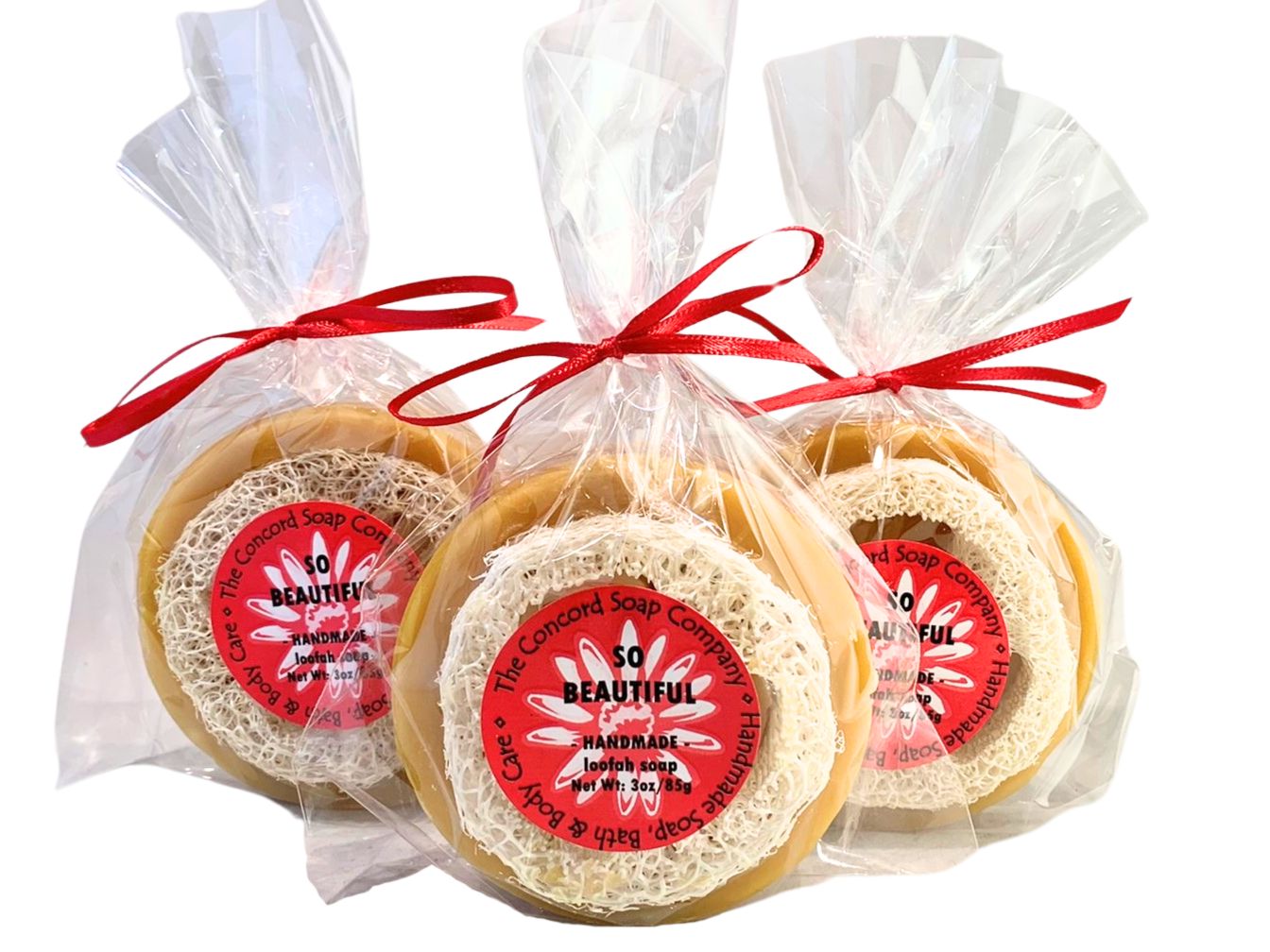 Our So Beautiful Loofah Soap is handmade in small batches to focus on quality! We use the cold process method and superior ingredients. This soap is made in a round, puck shape instead of our traditional rectangular bar. Each is allowed to cure for approximately 4-5 weeks. Our So Beautiful Loofah Soap is packaged inside a clear cello bag tied with a red ribbon.