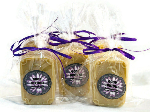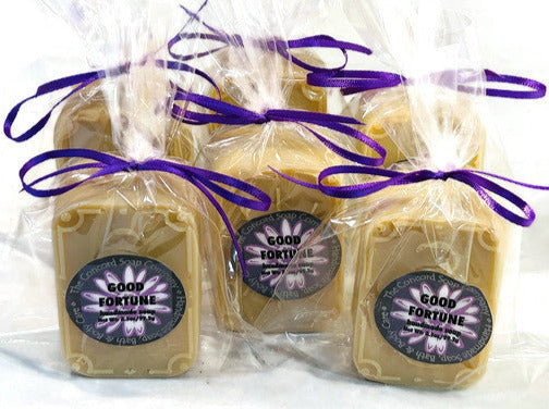 Our Good Fortune Soap is handmade in small batches to focus on quality! We use the cold process method and superior ingredients. Each is allowed to cure for approximately 4-5 weeks. Our Good Fortune Soap is packaged in a clear cello bag closed with a purple colored ribbon.