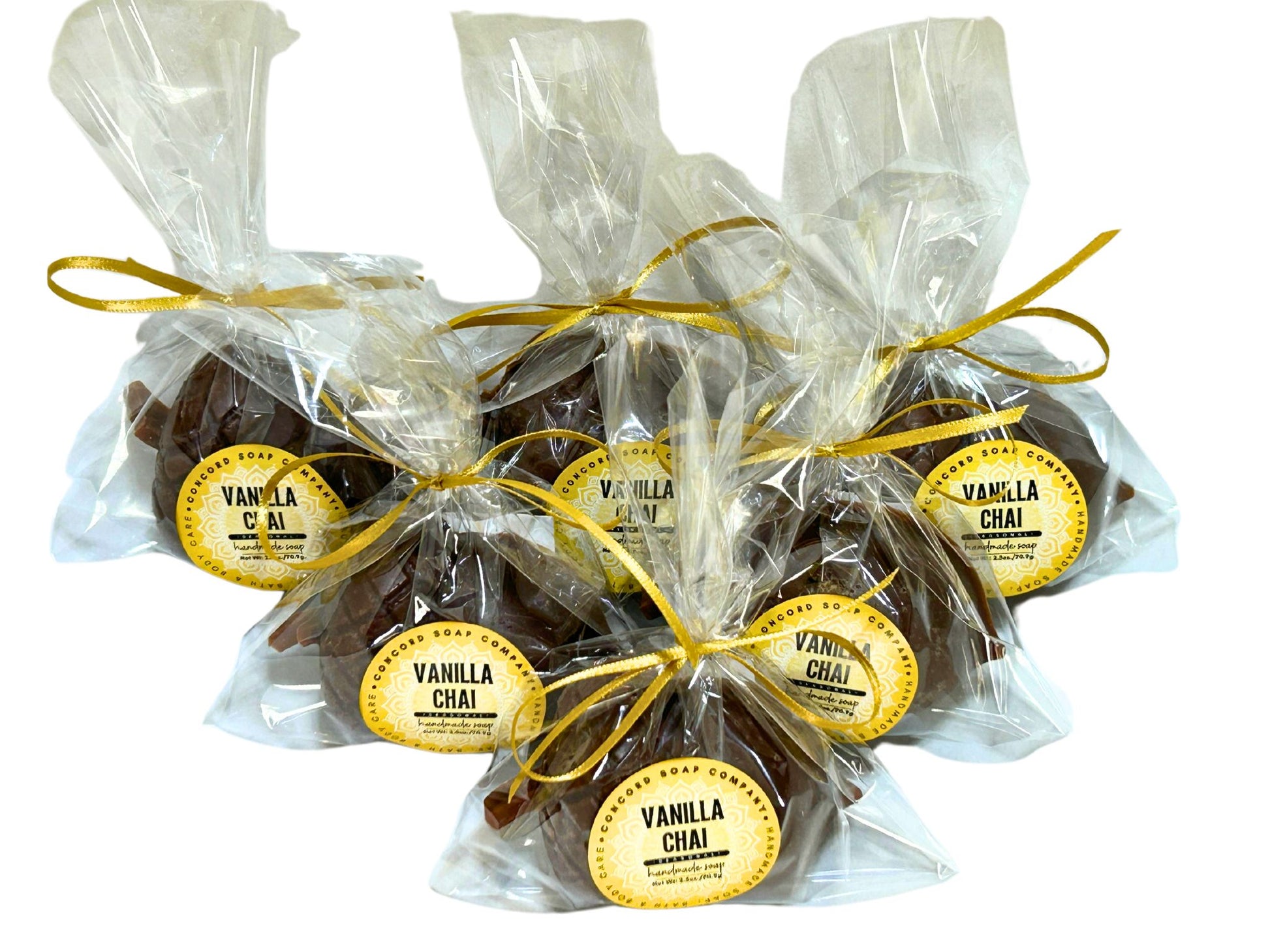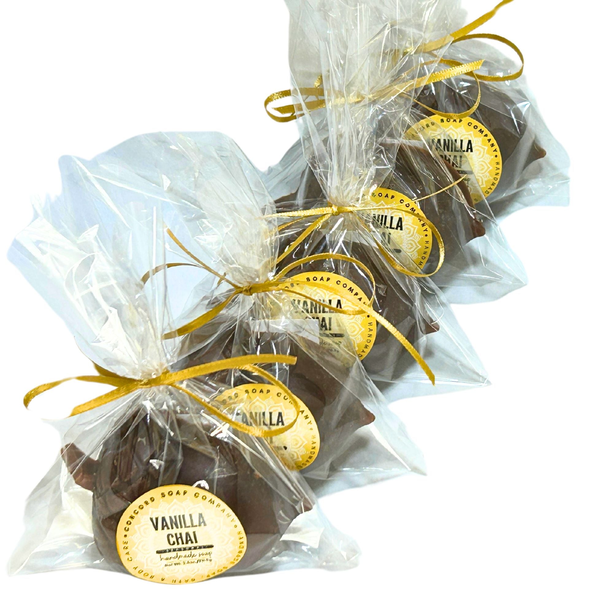 Our Vanilla Chai Soap is handmade in small batches to focus on quality! We use the cold process method and superior ingredients. Each soap bar is allowed to cure for approximately 4-5 weeks. Our Vanilla Chai Soap is a smaller 2.5 oz. size, shaped like an acorn, and packaged in a clear cello bag closed with a gold ribbon.