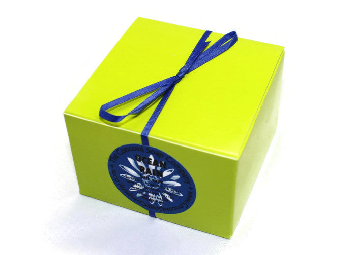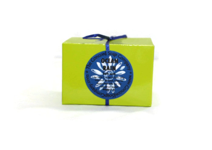 Our bath salts are handmade in small batches to focus on quality. This five ounce box of salts can be used for more than one bath. Our Ocean Rain bath salts are packaged in a small zip top plastic bag, placed inside a lime green box and sealed with a royal blue ribbon and label.